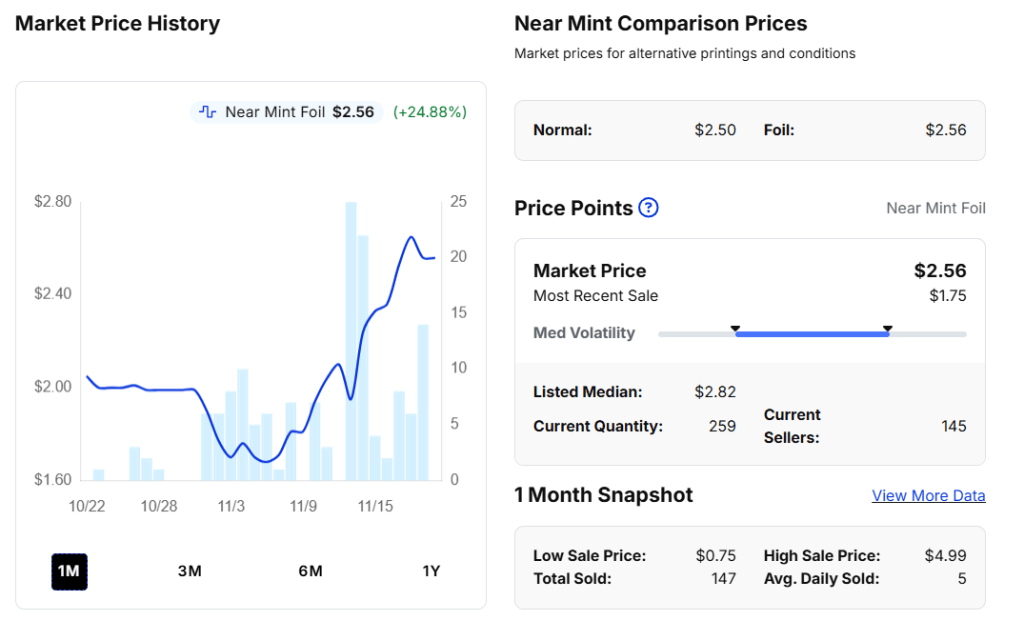 This is one of the biggest price spikes this week, but comes with a pretty clear caveat: Cards from a new set tend to drop a lot once the set releases, and Avatar: The Last Airbender officially releases tomorrow (November 21).
