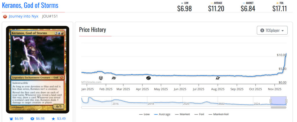 Keranos, God of Storms has roughly tripled since November started, jumping from the low single digits to around $9โ11. It was priced at around $3 for most of the year; then jumped to about $4 by the start of November, and nowadays its near-mint copies go for almost $10 in the US market.