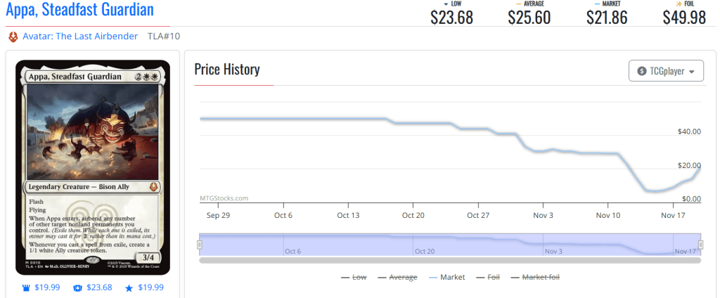 Yeah, well, the puns write themselves in this case: A flying sky bison, with sky-high prices. Appa, Steadfast Guardian regular copies have roughly tripled over the past week, sitting around $20โ25 now and up from around $7-$8 a few days ago.