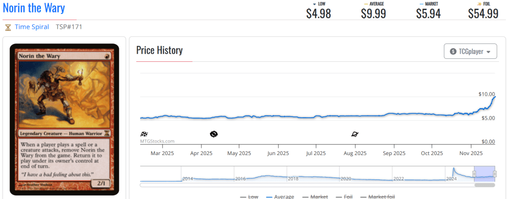 Compared to the flashy spikes above, Norin the Wary is having a quieter moment. Over the last week itโs up about 30%, with roughly 50% gains over the last month, taking original Time Spiral copies close to the $10 mark.