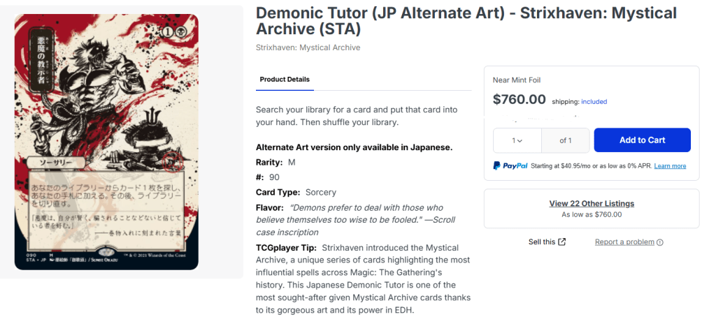 Source: TCGPlayer – Demonic Tutor (JP Alternate Art, Regular Foil) – Strixhaven: Mystical Archive (STA)
