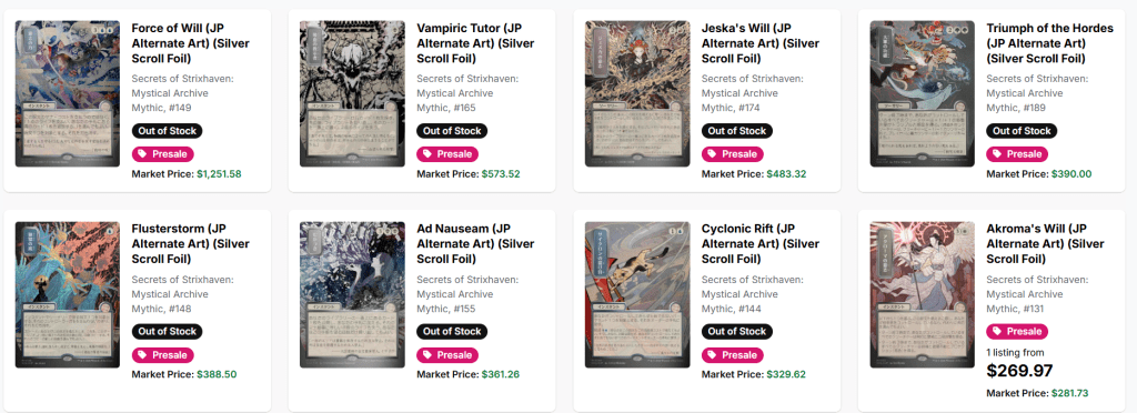 According to WotC's Collecting Secrets of Strixhaven article, Silver Scroll foil Japanese Mystical Archive cards can be found in Secrets of Strixhaven Collector Boosters of all languages, and some of those chase cards are already showing some extremely silly spicy price tags. Force of Will’s Japanese alternate-art Silver Scroll foil is listed at over $1,200, Vampiric Tutor’s version at around $570, and several others of the most expensive cards in this bonus sheet were in the $300-$400 range.