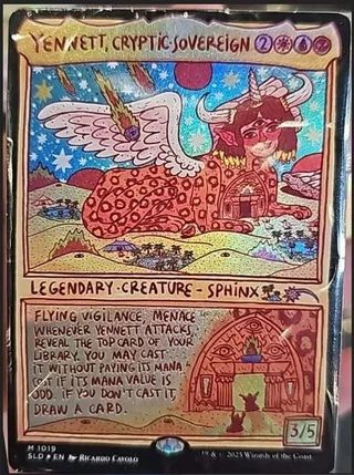 The post was simply titled โSecret Lair Deck Leakโ, so it's gotta be a Commander deck, right? The commander of the deck appears to be Yennett, Cryptic Sovereign. Of course, since it's a precon, Sol Ring?! At least the art style is absolutely bonkers. A new full art island is nice too.
