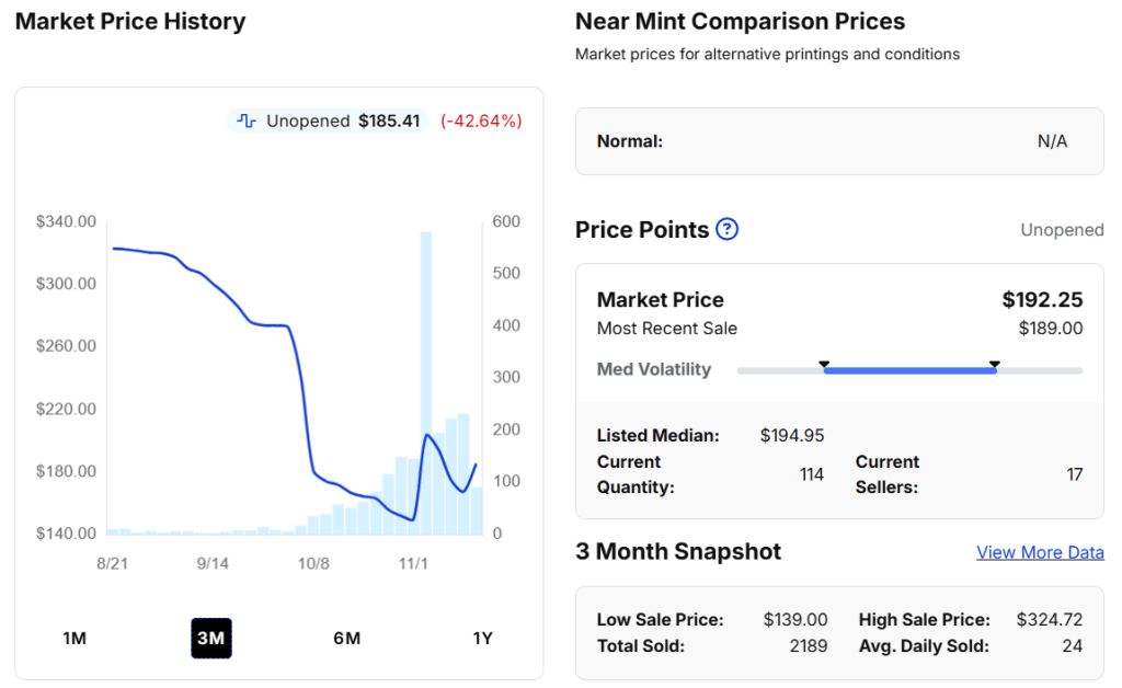 Current prices have rebounded to around $180-$190, which is around 70% higher than WotC's recommended retail price, and about 25% higher of what we'd call fair prices.