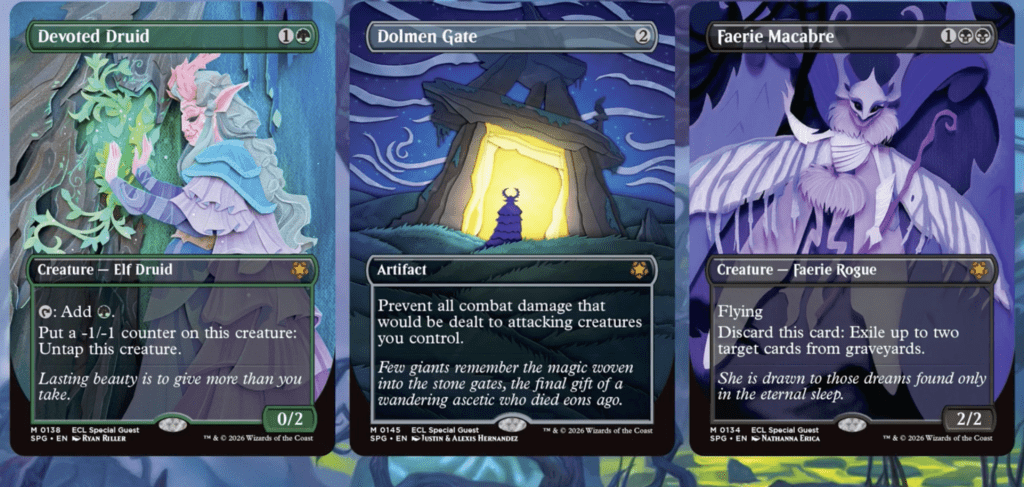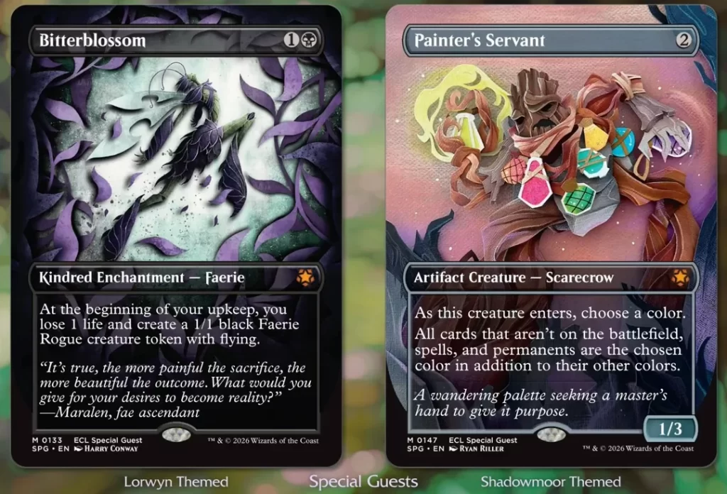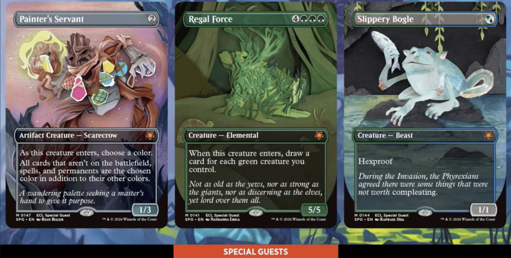 They give Lorwyn Eclipsedโs Special Guests an extremely unique art style. Special Guests are a prime space for Wizards to let artists flex their skills. While early Special Guests from sets like Lost Caverns of Ixalan and Modern Horizons 3 similar had stellar art often tied to the plane the set took place one, recent entries have become bolder, with defined themes and art that deviates from Magicโs norms. Edge of Eternities (EOE), for example, had Special Guests with art resembling pulp magazine science fiction art: