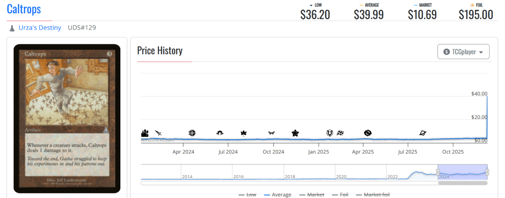 The first Marvel Super Heroes previews dropped yesterday, and predictably the market went hunting for the next big Commander combo. This time the target wasnโt a shiny new mythic, but an old, uncommon artifact from Urzaโs Destiny thatโs been quietly hanging around the $3โ$4 range on the back of niche EDH play: Caltrops.