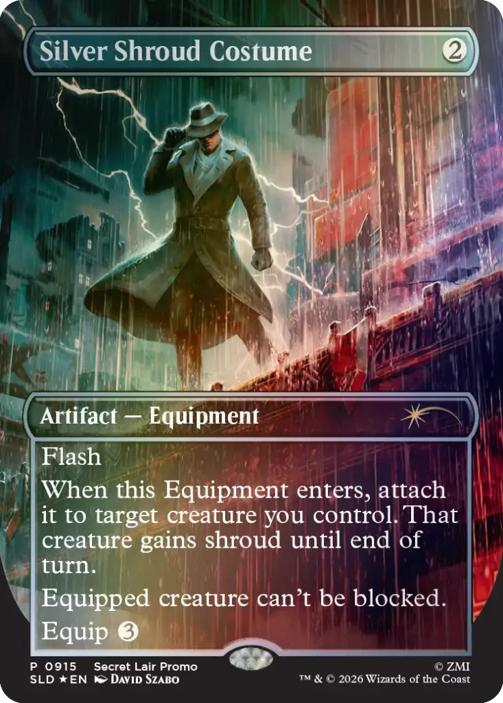 A copy of Silver Shroud Costume will be included for every $149 spent through the Secret Lair website (while supplies last). This is another Fallout Commander deck card that's running a price just over $10, and it's pretty good too, so not too bad as far as throw-ins go.