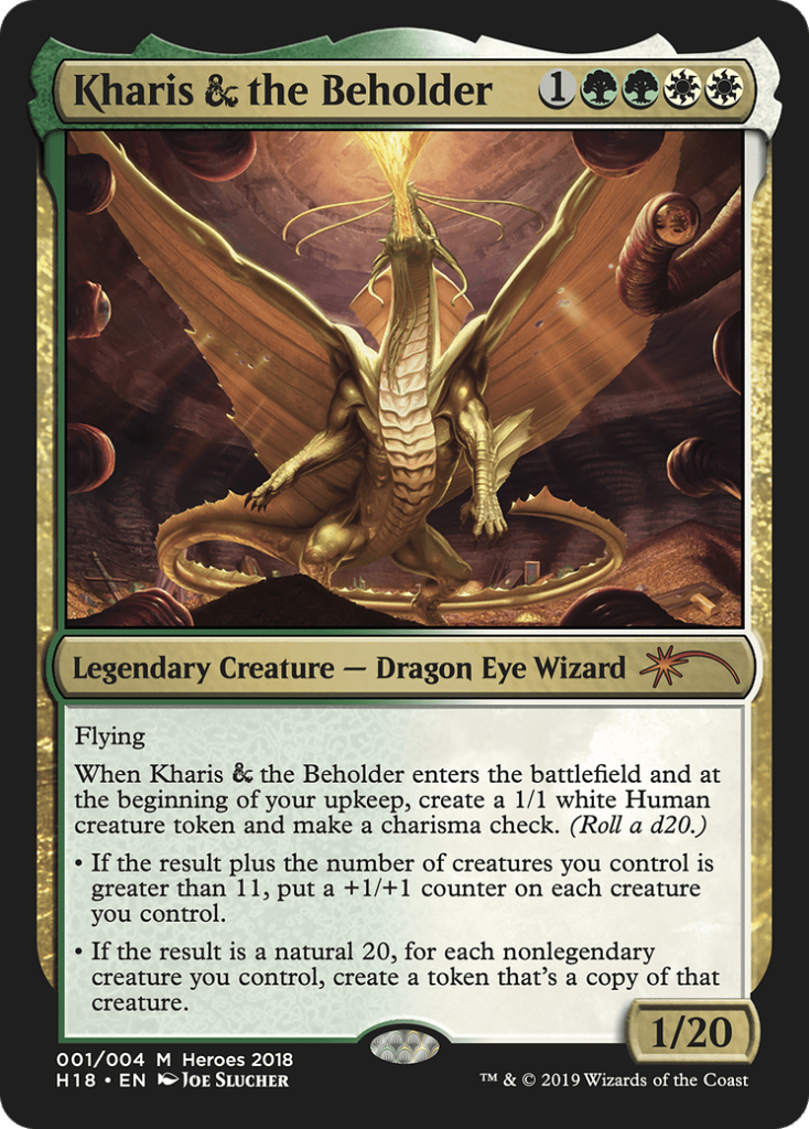 I really enjoy the Heroes cards that give a nod towards D&D mechanics. Dungeon Master uses dice-rolling mechanics to determine its loyalty and the effectiveness of its planeswalker abilities, while Kharis & the Beholder's charisma check feels like something we could see in a future D&D crossover.