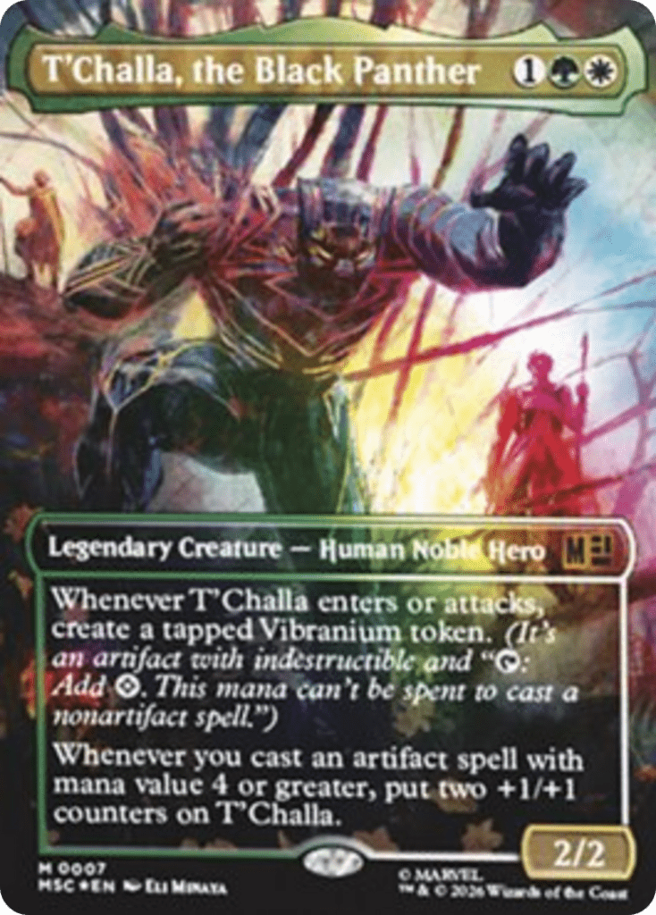 T'Challa, the Black Panther is a human noble hero who creates a tapped Vibranium token when entering or attacking, and that gets two +1/+1 counters whenever you cast an artifact spell with mana value 4 or greater.