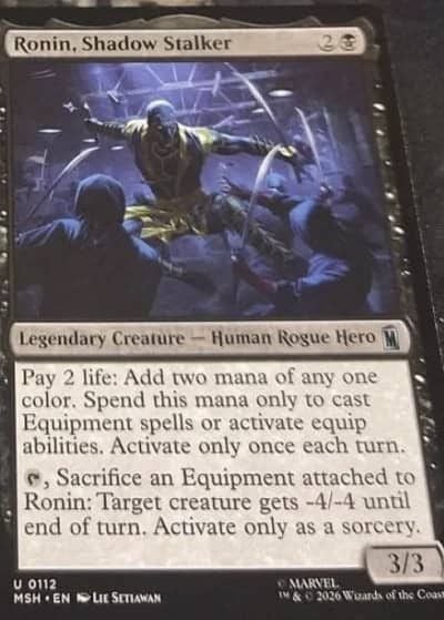 Finally, there's Ronin, Shadow Stalker. This is definitely my favorite card among these four simply because it does something very unique. Usually only white and red get to care about equipment, or at least they care about it a whole lot more than all of the other colors, and it can be hard to make an equipment deck outside of those colors. Not only is this a black card that supports an equipment theme, but it also interacts with them in an interesting way, letting you sacrifice equipment that you've attached to it to kill your opponents' creatures. This also points to a potential broader equipment theme in Limited, which is always fun to have.