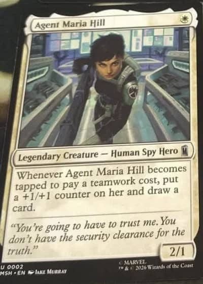 These cards point to some interesting themes for Marvel Super Heroes. First of all, there's a whole new mechanic on Agent Maria Hill: Teamwork. As for what teamwork does, your guess is as good as mine, but from the wording of the card, it seems to have a cost associated with it. It could be that some cards have a teamwork ability, or that some spells have an additional teamwork cost. There is also tapping of creatures involved, which reminds me of Convoke or Waterbending, although at this point, this is all speculation and we won't know anything about teamwork until official spoilers start coming out.