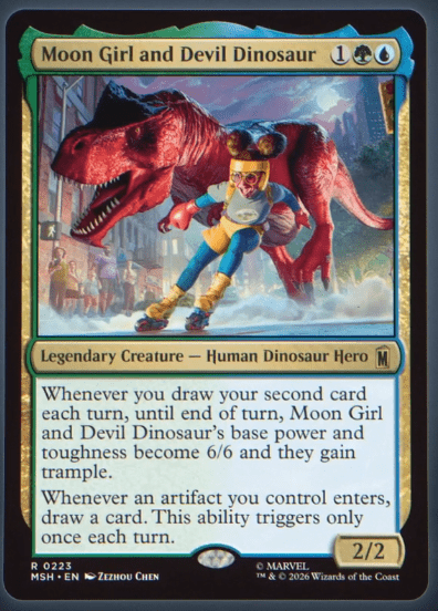A 2/2 dinosaur, eh? Moon Girl and Devil Dinosaur gets huge when you draw your second card each turn, essentially becoming Colossal Dreadmaw for half the price. Oh, and it wouldn't be a Simic commander if it didn't draw cards, in this card once per turn when an artifact hits the board. This โartifactfallโ ability will show up a bit more in the set.