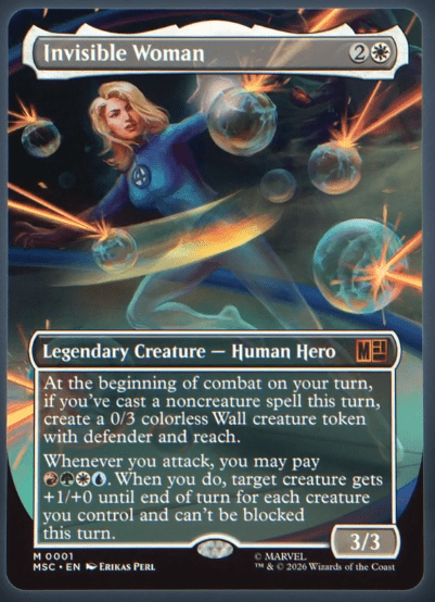 Missed opportunity to leave the art on Invisible Woman blank. Regardless, here's a new no-black 4-color commander that walls up and makes a bunch of things unblockable. Mister Fantastic puts reach to good use, even if it feels weird on a blue card. Copying abilities is pretty sweet, too.