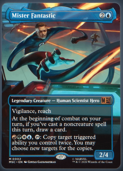 The following cards are specifically from MSC, the Marvel Super Heroes Commander decks. The following four cards are all part of a single Fantastic Four Commander precon, and are all interchangeable as the commander of the deck. That'll be one of four precons coming out with this set.
