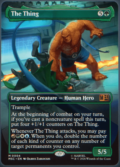 You're probably sensing a noncreature theme here with The Thing, a new counter doubler that gets big real fast. Shouldn't be too hard to make this a 9/9 trampler the turn it enters. As Blake Rasmussen pointed out on stream, The Thing can represent lethal commander damage in just a turn or two. Human Torch is another beater that's designed specifically to just deal a bunch of damage.