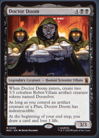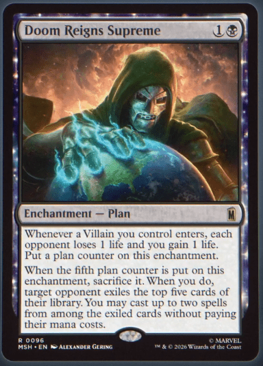Doctor Doom, besides being a bunch of robots in a trenchcoat, brings โplansโ to the game. These are an enchantment subtype that build up plan counters as you do something, then pay you off with some sort of big effect. Doom Reigns Supreme is a pure villain payoff that drains opponents over time, then eventually turns into two free spells.