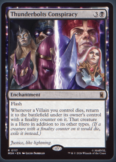 Thunderbolts Conspiracy is another all-in villain payoff that turns your baddies into goodies. This might be a fun Limited buildaround, or perhaps the crux of villain Commander decks, which might finally get there with this set.