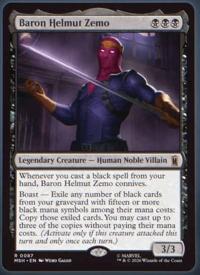 Conniveโs a great mechanic to see on a villain like Baron Helmut Zemo. It fits into typical black devotion shells and feels like an incredible finisher for an all-in black deck. Boast might be a one-off here, but it's an appropriate addition to this card.