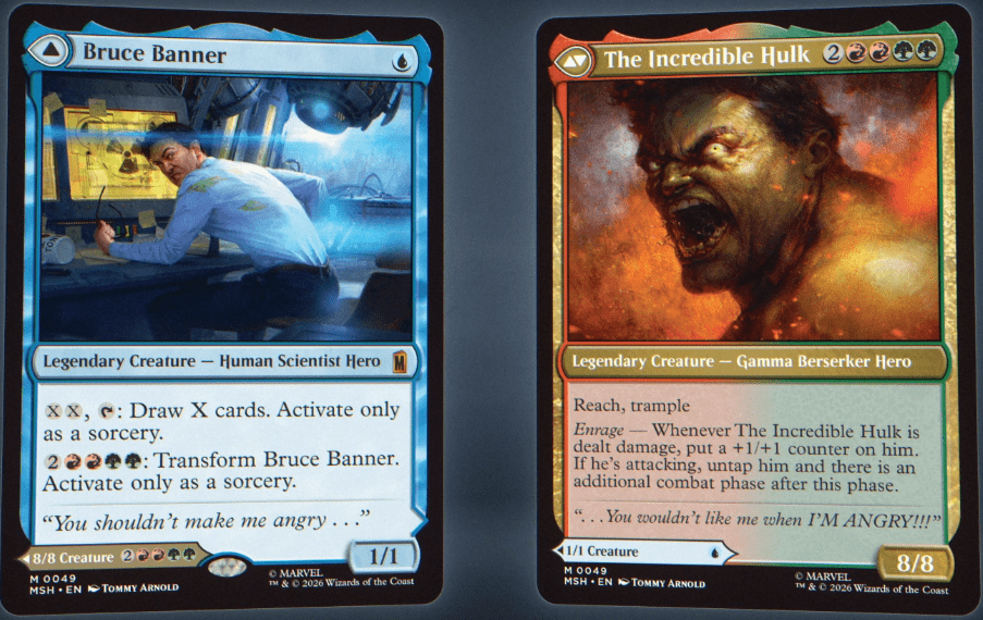 The transforming MDFC legends are returning from Marvel's Spider-Man. Here we've got Bruce Banner, a pretty straightforward card advantage commander that turns into The Incredible Hulk, a smashy smashy Gruul creature with a sweet and flavorful enrage ability.