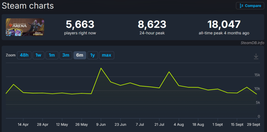 To make matters worse, digital Magic players are replicating the lukewarm reception that Spider-Man has gotten on tabletop, as seen in MTG Arena's very mild spike in player count for this newest set:
