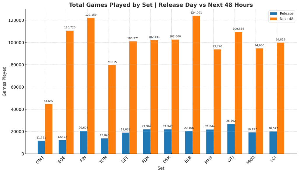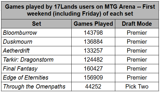 And we saw the exact same trend during the weekend. When looking at the first Friday, Saturday, and Sunday of each set, and comparing the number of Premier Draft games logged by 17Lands users, Through the Omenpaths barely reached 44,200 players, down from 160,400 players for Final Fantasy, and 156,900 games for Edge of Eternities – a 70% drop% in this case.