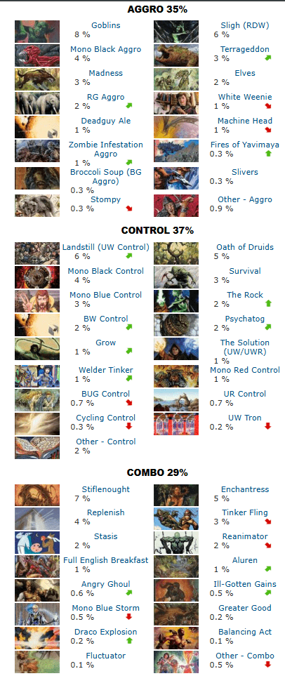 And best of all: Premodern has a very varied metagame! All three major archetypes are represented in a nearly-perfect three-way split: 35% of the metagame is aggro decks according to MTGTop8, 37% is control decks, and 29% is combo decks. And no deck has more than an 8% share in the last couple of months: