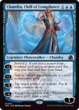 The only thing that really catches me up is the collector numbers. Chandra, Torch of Defiance appears to have a collector number of 244, and “Chill of Compliance” appears to be in the low 200s as well, possibly 212. A blue card in a normal-sized MTG set would land below #100 in most sets; for example, the three blue mythics in SOS are #44, #45, and #58. So why is this blue Chandra up in the 200s, and why isn't there that big of a gap between this blue card and the red Chandra, with a whole color separating them in WUBRG order?