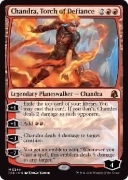 The Chandra's equally strange. We've got a reprint of Chandra, Torch of Defiance squaring off against a mono-blue version of the planeswalker. The arts seem to line up in such a way that the two Chandras occupy the same scene, locked in battle against one another.