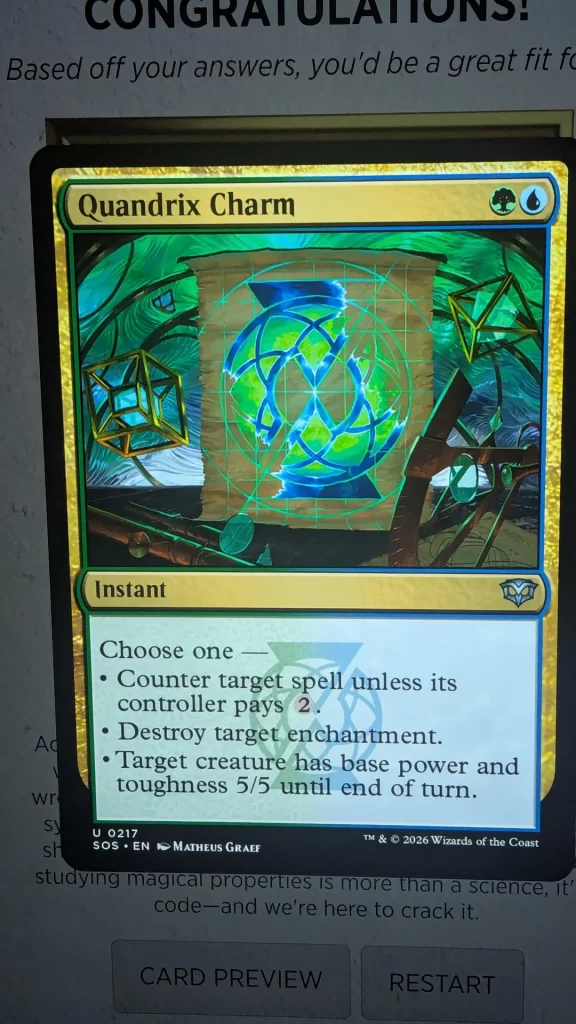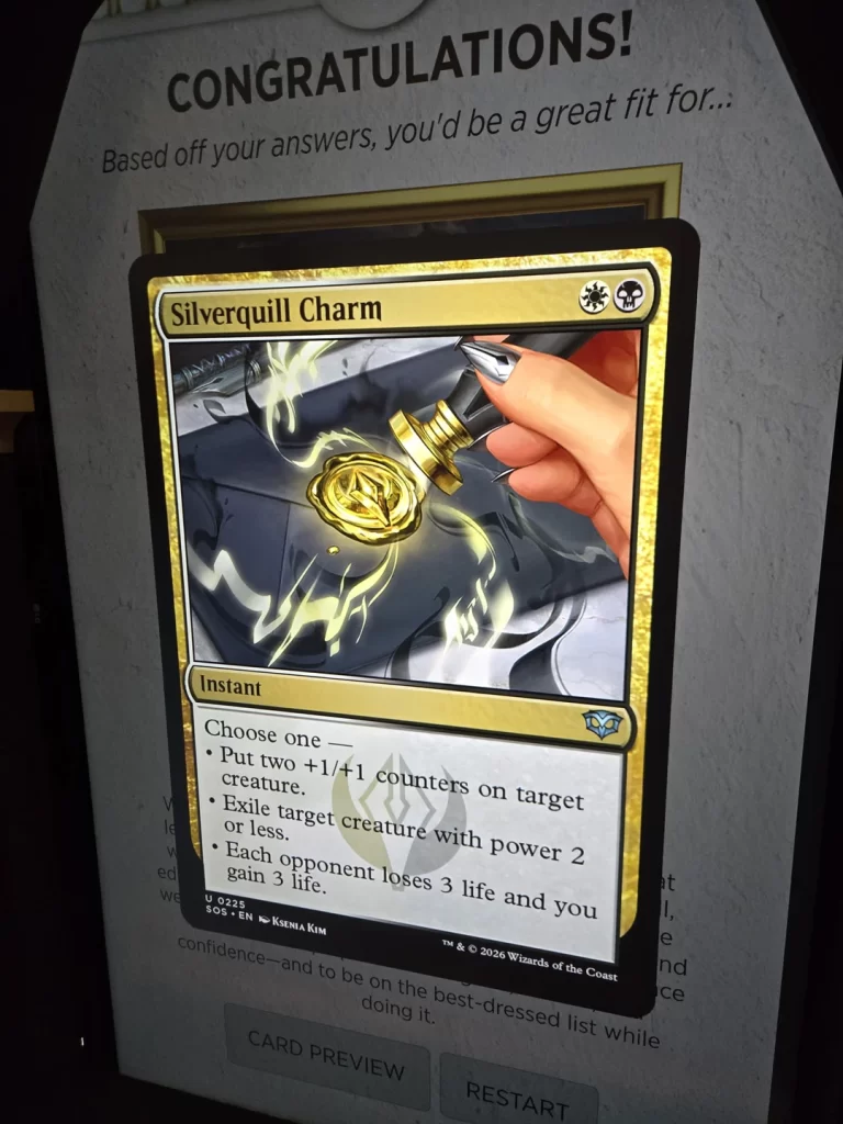 Silverquill Charm is perfectly meh. It’s solid in Limited, but the removal is super narrow and the drain 3 option verges on unplayable. The counters are decent—a permanent combat trick has utility, and white has counter payoffs, but it doesn’t redeem the other modes’ faults.