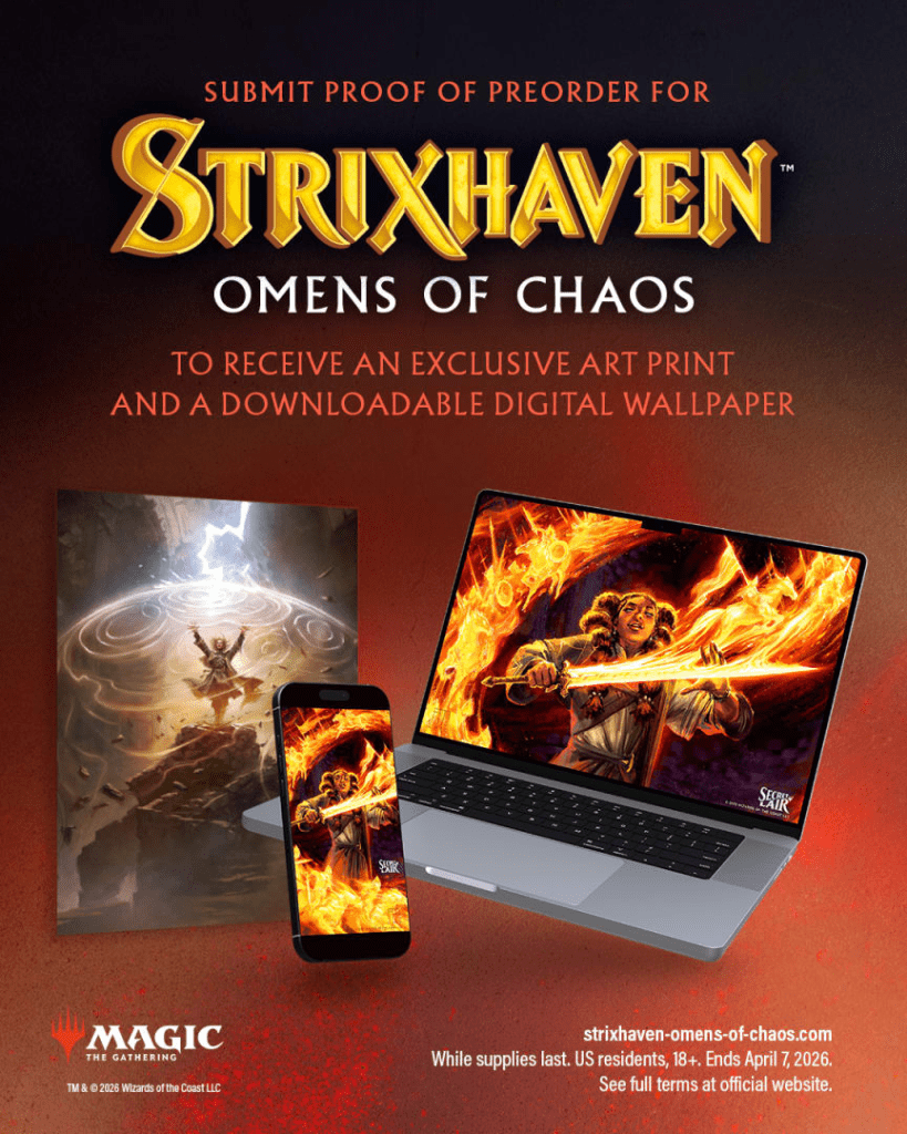 Del Rey Books is adding a pair of Magic-themed preorder incentives to Strixhaven: Omens of Chaos, the upcoming Magic: The Gathering novel by Seanan McGuire, scheduled to release on April 7, 2026. The first-printing hardcover includes an exclusive Command Tower promo card with new Strixhaven-themed art, while readers who submit proof of preorder through the official promotion page can get a physical Batwing Brume art print by Bryan Sola and digital Chance for Glory wallpapers by Andrew Mar.