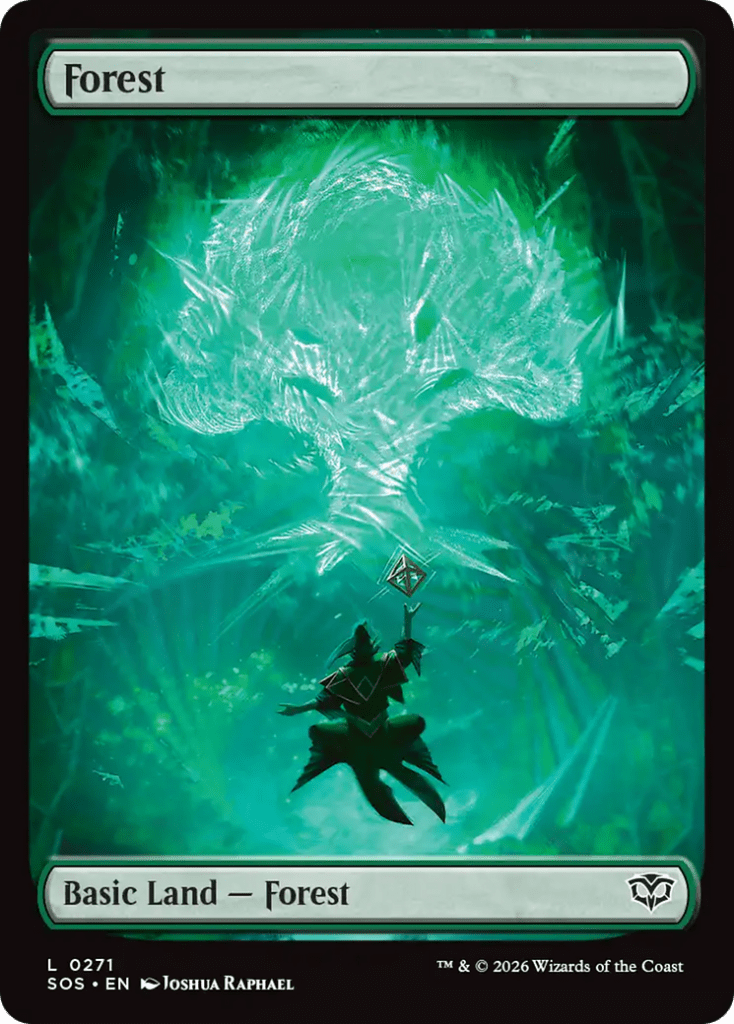 Most sets have full-art lands these days, and this set delivers. These basic lands are very beautiful, and they depict the MTG basic mana symbols being cast as powerful spells. And we can get them in traditional foil, too, in any kind of booster, with each Collector Booster guaranteed to have one.