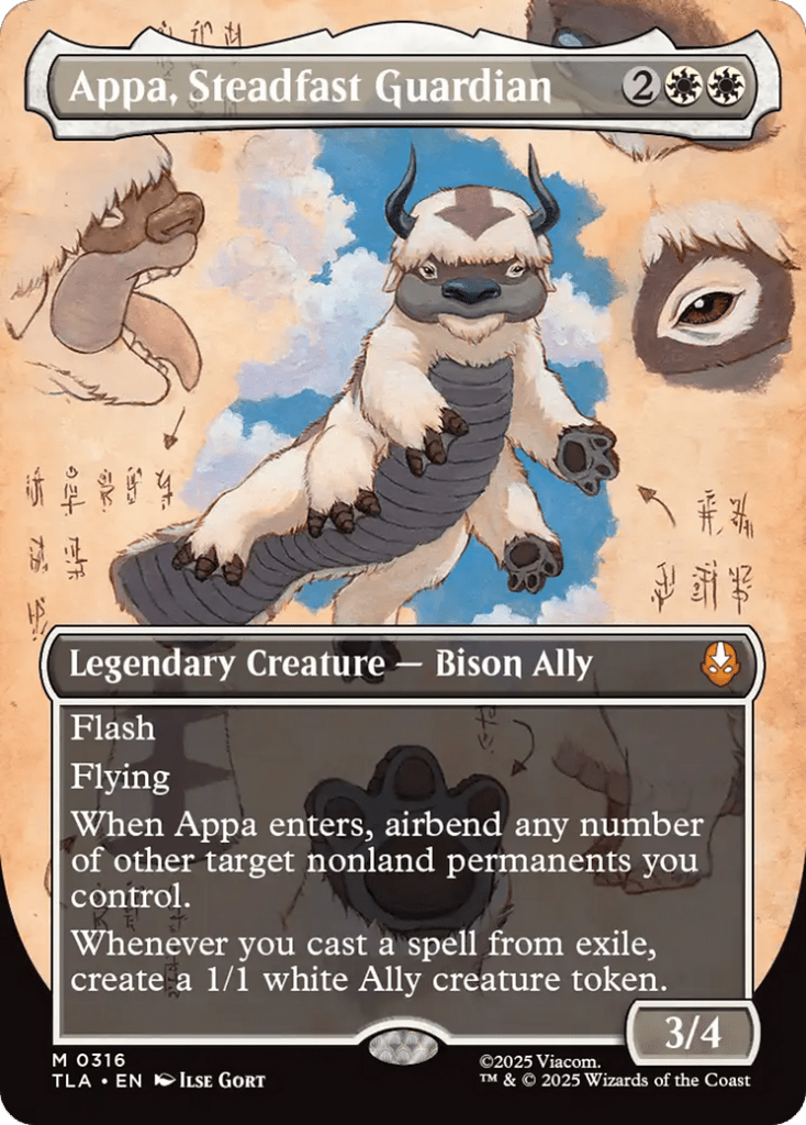 These cards reflect the creatures found across Aangโs journey, conveying a unique feel. There are 15 of these in TLA, including Appa, Steadfast Guardian, Momo, Friendly Flier, and Tiger-Seal.