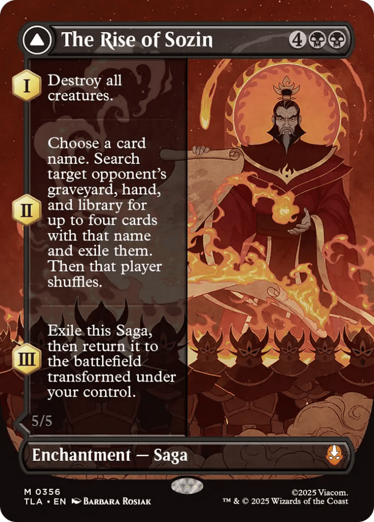 Five mythic rares from TLA are sagas that received this special treatment. These can also be found in TLA Play Boosters and Collector Boosters, in both foil and nonfoil versions: