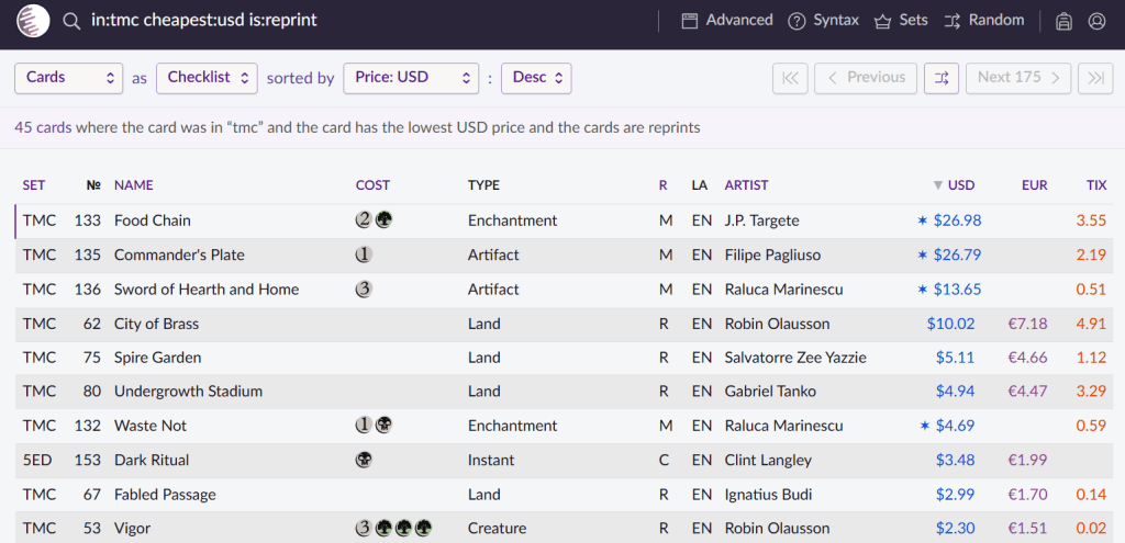 If you ask Scryfall to show you the most expensive reprints in TMC, and show you the cheapest version, it turns out that the TMC version is actually the cheapest of them all in nine out of ten cases, with Dark Ritual being the exception.