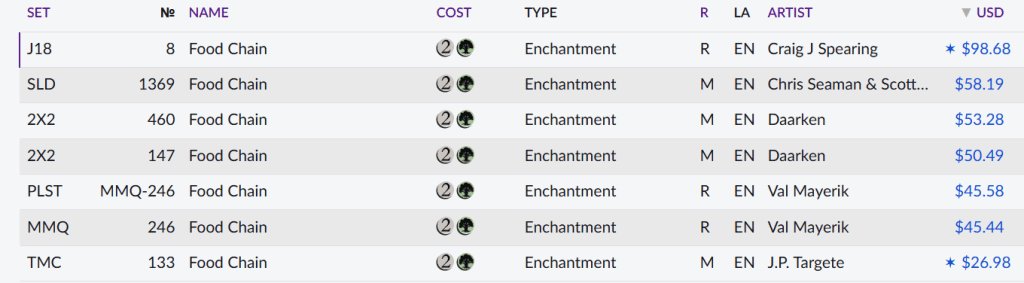 For example: There are seven different printings for Food Chain; the most expensive is a Judge Gift Card that costs almost $100, then five different versions that are priced between around $45 and $60… and then the bottom-barrel TMC version, which is priced just about half as the next cheapest!