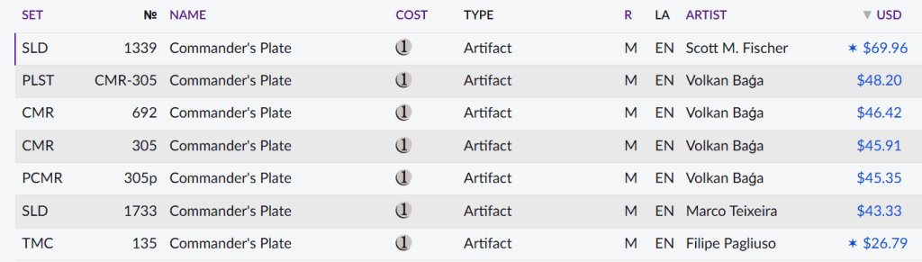 Something similar happens with Commander's Plate: It has seven different printings, the most expensive is a Secret Lair version (costs about $65), then there are five versions tightly packed in the $43-$48 range… and the TMC version for just about $27.