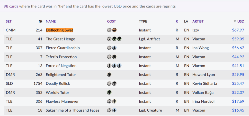 But, for starters, the cheapest version of the most expensive reprint (Deflecting Swat) is not from Avatar, and only six of the top then are. And once you dig into the prices, the differences are minimal: TLE's The Great Henge costs about $59 while the next cheapest, the Commander Masters version, is about $62; and TLE's Fierce Guardianship is just a couple of pennies cheaper than the Commander Masters version.