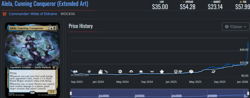 Another benefactor of the new faerie commander, Alela, Cunning Conqueror has spiked this week, by a respectable margin.