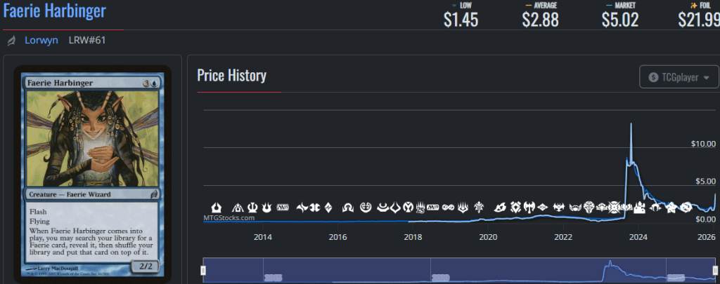 While far from the flashiest faerie (despite having flash), Faerie Harbinger is a solid addition to faerie decks as a reasonable tutor you can hold up alongside counterspells and other tricks. Notably, it can find kindred cards with the faerie type, like Bitterblossom and Firdoch Core, so itโs more versatile that it might look.