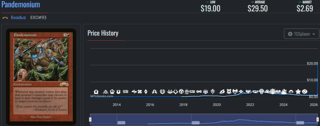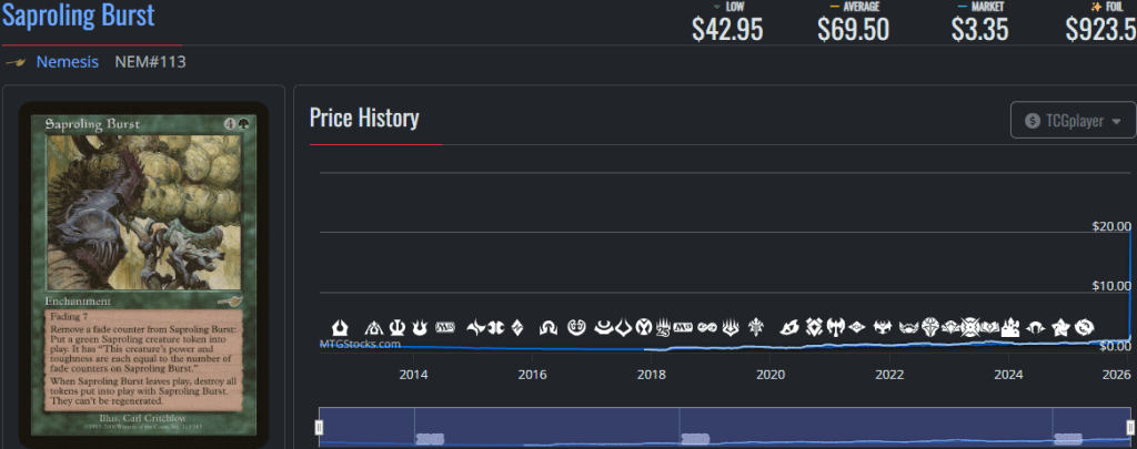 Pandemonium and Saproling Burst deserve to be bundled together because their sharp spikes are due to the same event: The recent banning of Parallax Tide in Premodern.