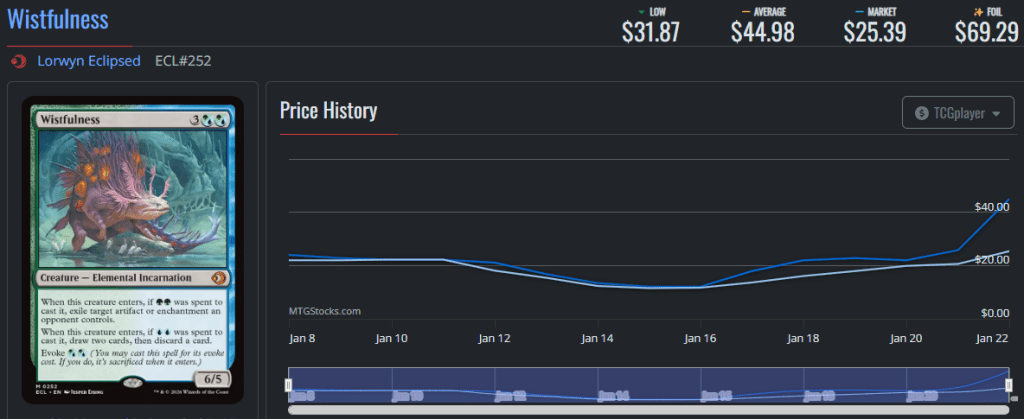Wistfulness is already making a name for itself in Standard. Itโs been quickly adapted by Simic Natureโs Rhythm/Ouroboroid decks and a deck built around Wistfulness and the rest of the evoke elementals cycle took second place in a recent MTGO Standard Challenge. It also has potential as a Commander staple, as the card filtration and artifact destruction are extremely relevant in the format. Note that ECL has barely come out; the price of new cards are always open to big fluctuations, so this high of $44 dollars might not last long.