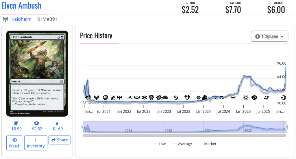 Amidst this elven onslaught, Elven Ambush has become quite a pricey uncommon, jumping around 150% (from about $3.10 last friday to about $7.70 today).