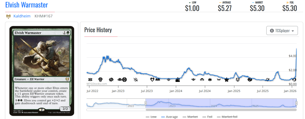 Elvish Warmaster helps you go wide, then helps your whole board go tall. And in the last few days it has been going up, and up, and up!