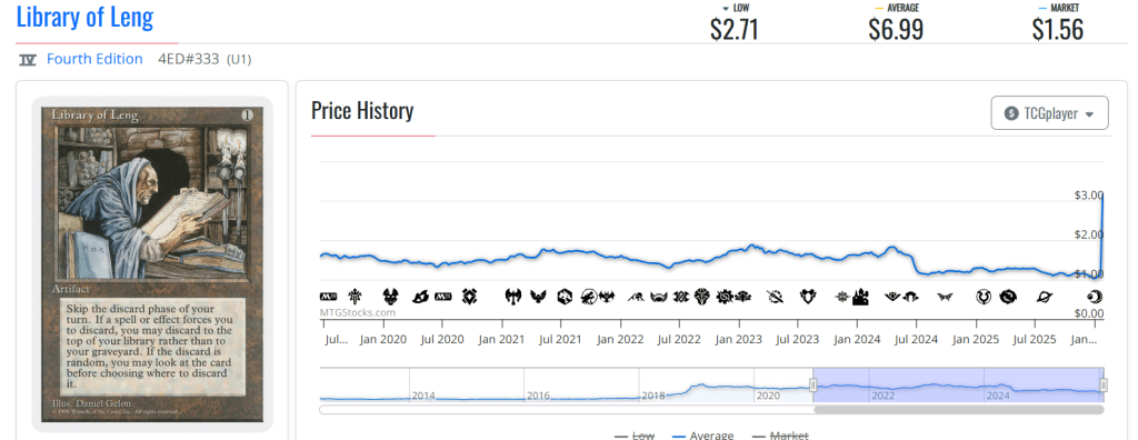 Library of Leng is a very old card with quite the complex text (as we're about to see in a bit, since it deals with the subtle difference between costs and effects), and is one of this week's biggest spikers, jumping from about $1.15 to nearly $7 in the last seven days.
