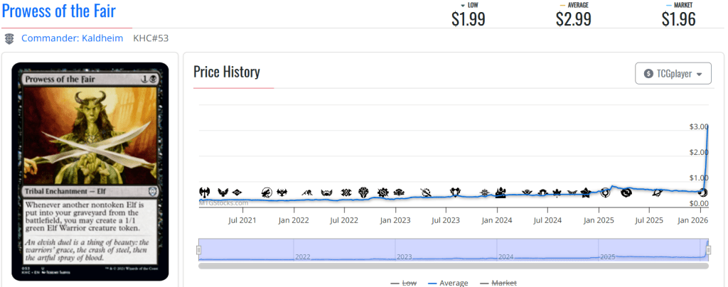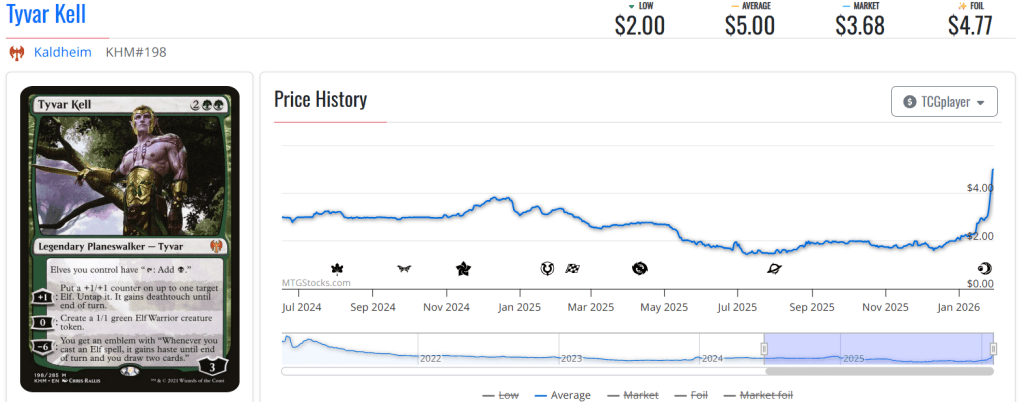 Elvish Warmaster sees play with both (and in Morcant decks above all, with a 66%+ inclusion rate), which would be enough to push the card up. But it turns out that, besides this sudden โCool new commanders!โ hype, the Warmaster has a lot of competitive punch in two different formats: several cEDH elf commanders want him in the 99, and it also sees play in competitive elf decks in Modern. And such demand has pushed it to around $5.25, up from $1.25 a week ago.