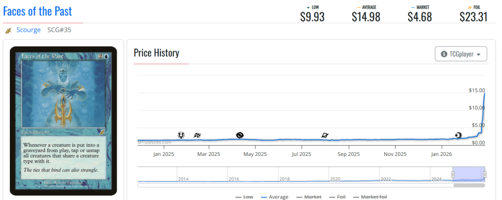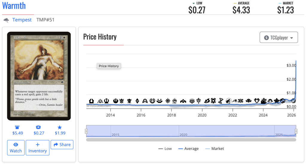 While it's only sideboard tech, Warmth sees play in a lot of top-tier competitive decks in Premodern. And its original Tempest printing has gone up more than 200% since last week, from about $1.40 to over $4.30.
