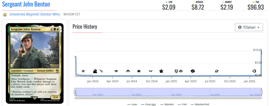 It's hard to guess why, though. Haste plus a curiosity effect is an unusual mix of abilities for Selesnya, and the good ol' Sergeant has sporadically shown some cEDH results, but he's moderately popular as a casual Voltron commander, sees modest play in the 99, and doesn't seem to have any synergy with either Lorwyn Eclipsed or Teenage Mutant Ninja Turtles.