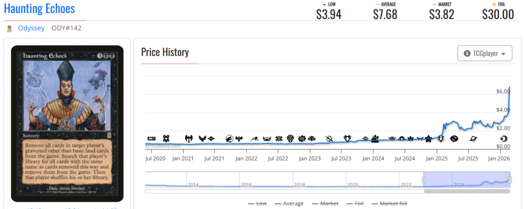 Something similar is happening with Haunting Echoes, a black sorcery that sees a lot of competitive Premodern play, usually in Psychatog and The Rock decks, and went from about $4 to around $7.40 in the last seven days.