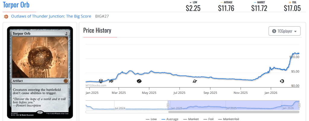 And Torpor Orbโs competitive success is not limited to Standard: UrzaTron in Modern also plays a copy in its sideboard, and Magda, Brazen Outlaw is very fond of this artifact in cEDH.