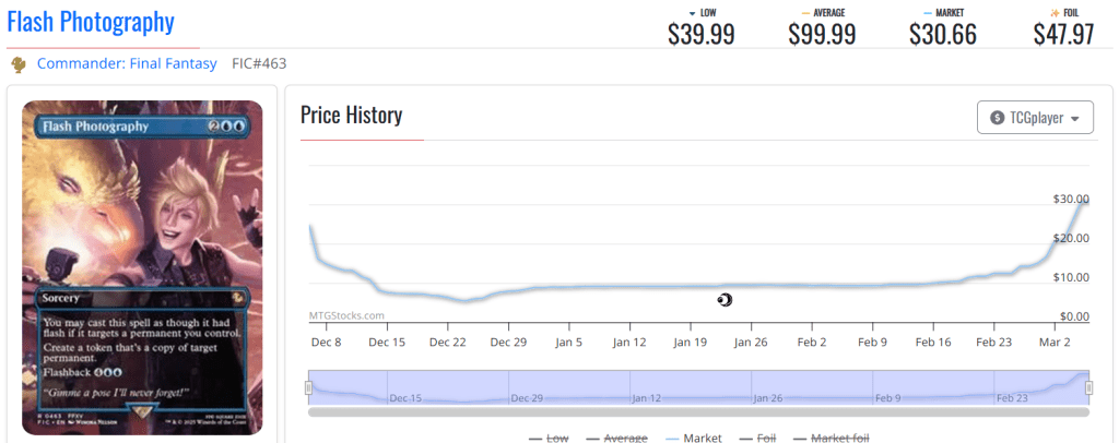 Final Fantasyโs Flash Photography is a very niche card in casual Commander decks: a pretty low play rate, and the commander that includes it most often is Noctis, Heir Apparent.